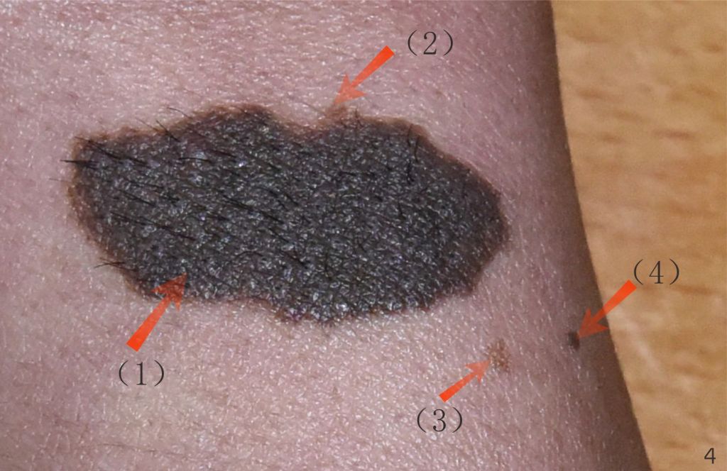 ↑ (1) Main birthmark (2) the edge of the exosmosed part of the wood oil birthmark is very clear (3) accidental drops of oil that formed this small birthmark (4) Small accidental birthmark formed by droplets of oil and ash.