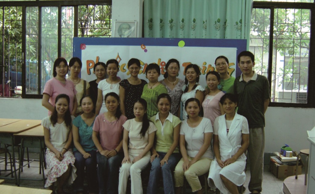 上图:李先生(右1)受邀对某公立小学全体英语教师培训一个月,渗透李先生的讲解、练习和测试三结合的高效课堂教学理论,减少表演式、吆喝式低效活动。这是一所3000人的公立小学,全部17名英语教师竟然都是女生,女教师婚恋难的原因一目了然。建议师范类招生按男女比例一比一进行,从源头解决问题。
