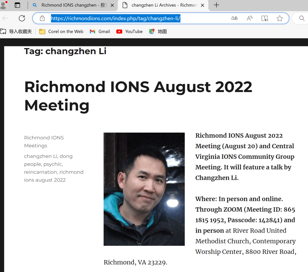 上图:受美国Richmond IONS机构邀请,作为特邀嘉宾做关于本人的轮回调查的专场1小时英语演讲。视频》Video speech in Richmond ION 网页介绍》》