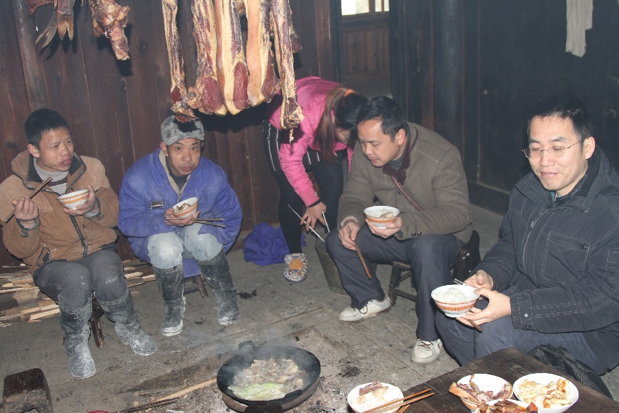上图:李先生(右1)2016年在侗族地区做轮回采访。Do reincarnation investigation among Dong people,2016